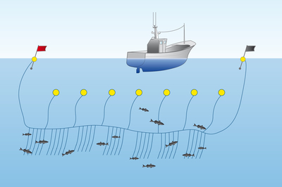 Longline fishing is a technique used by commercial fishermen in which a long line (or main line) is baited with multiple hooks. Each hook is attached at intervals by shorter branch lines called gangions (or snoods).