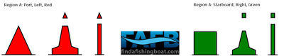 Coloured green, these marks are cylindrical or pillar shaped and fitted with a matching red cone topmark that points upwards; where fitted, lights are also green. Lights can flash in any rhythm, with the exception of 2+1.