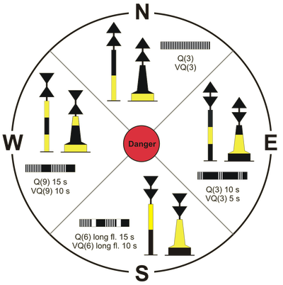 - Cardinal Marks – marking the position of hazards and the direction of navigable waters