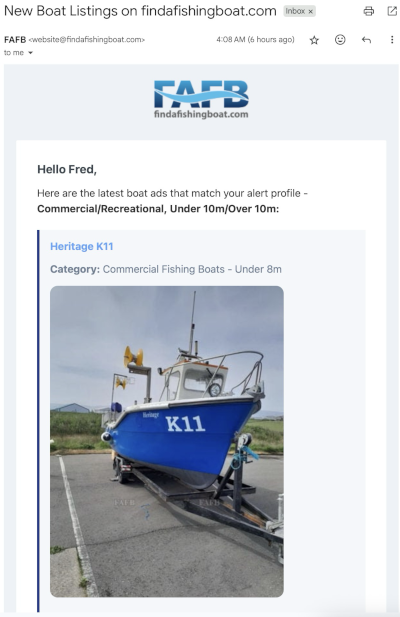 That's it - you now have alerts set up. Each day from now on, if there are new boat adverts that match your alert profile, you'll be able to check your email in the morning to see the new boat adverts on findafishingboat.com.